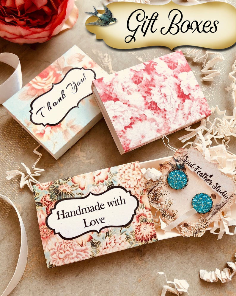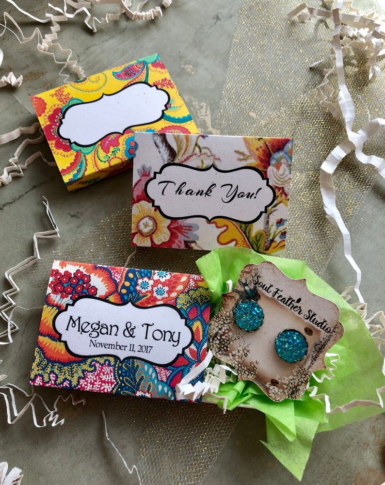 These boxes are perfect for earrings, necklaces, bracelets and small favors. Personalize them with your shop name for a more custom fun look.